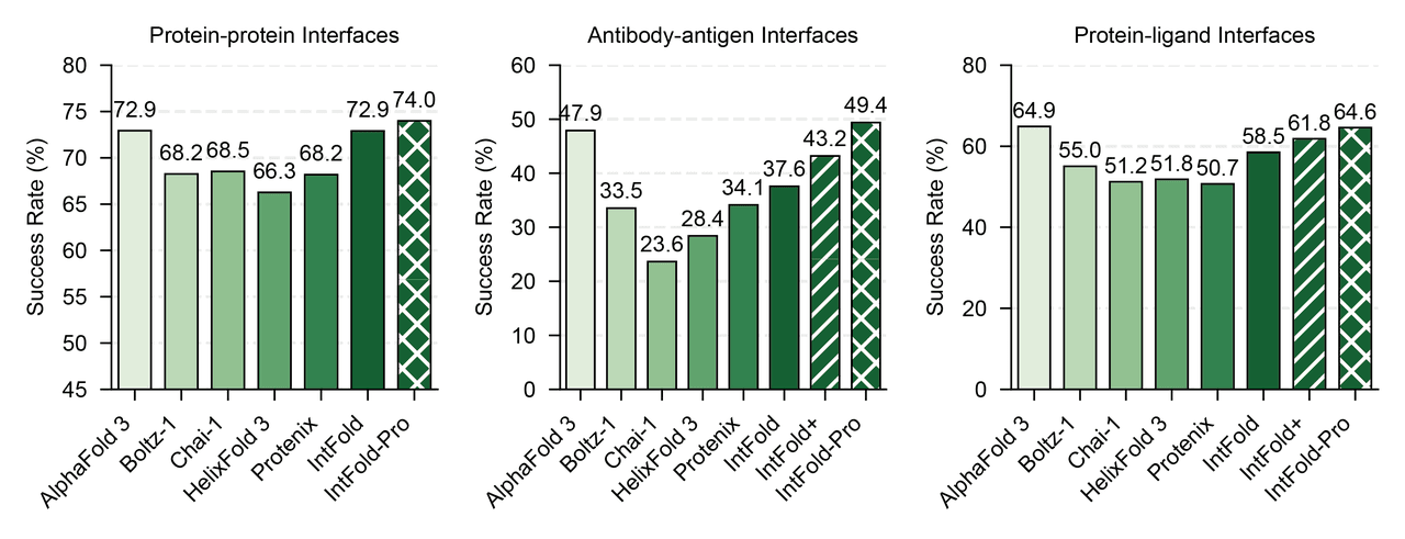 Основавайки се на архитектурни иновации и алгоритмична еволюция в рамките на GenAI, IntelligenAI предостави поредица от резултати, които са наравно с, или в някои случаи надминават AlphaFold3 и текущата индустрия SOTA: 1. Pro версията превъзхожда AlphaFold3 по множество ключови показатели.