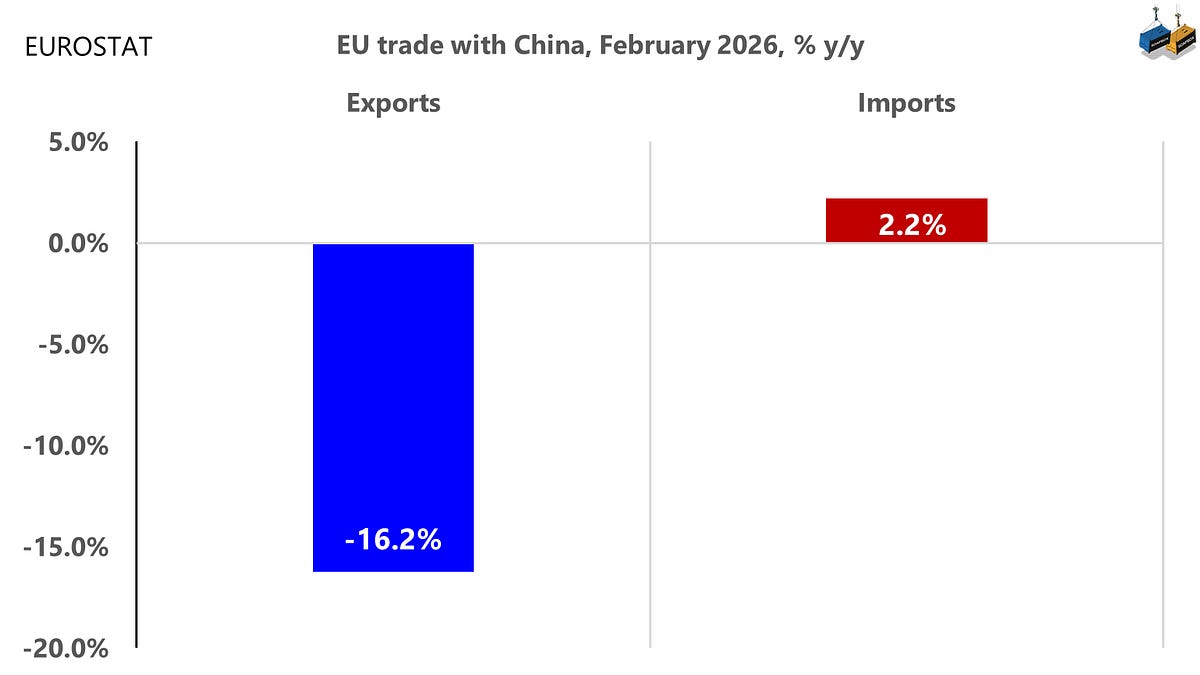 През февруари 2026 г. износът на ЕС за Китай е намалял с 16,2% на годишна база, докато вносът е нараснал с 2,2%. В резултат на това търговският дефицит на ЕС с Китай се увеличи с 14,1%, достигайки над 1 милиард евро на ден.