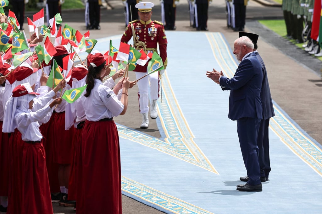 Бразилският президент Луис Инасио Лула да Силва беше посрещнат от маршируващ оркестър и национални химни на церемония в президентския дворец в Джакарта преди разговорите с индонезийския си колега Прабово Субианто.