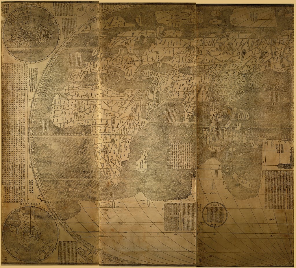 Отпечатана в Пекин през 1602 г., Kunyu Wanguo Quantu е карта на света, създадена от италианския свещеник Матео Ричи в сътрудничество с китайски учени. Снимка: Раздаване