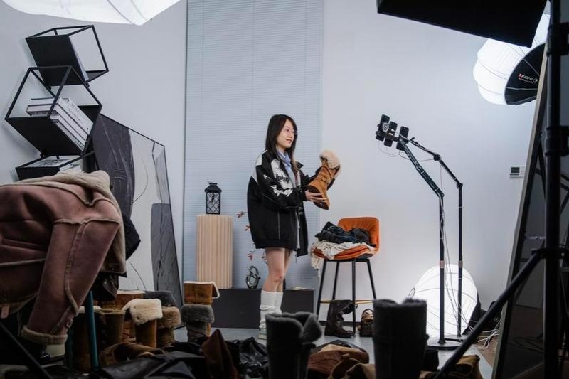 Член на персонала рекламира обувки чрез поточно предаване на живо в компания за мрежови технологии в квартал Ouhai на Wenzhou, провинция Zhejiang в Източен Китай, 10 ноември 2025 г. [Photo/Xinhua]