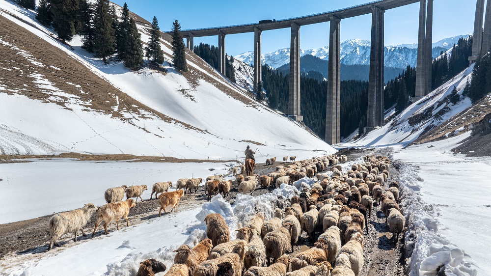 Пастир, управляващ стадо овце, минава под моста Guozigou на 15 март в окръг Huocheng на автономната префектура Ili Kazak, автономен регион Синдзян Уйгур. [Photo by Lai Yuning/for chinadaily.com.cn]