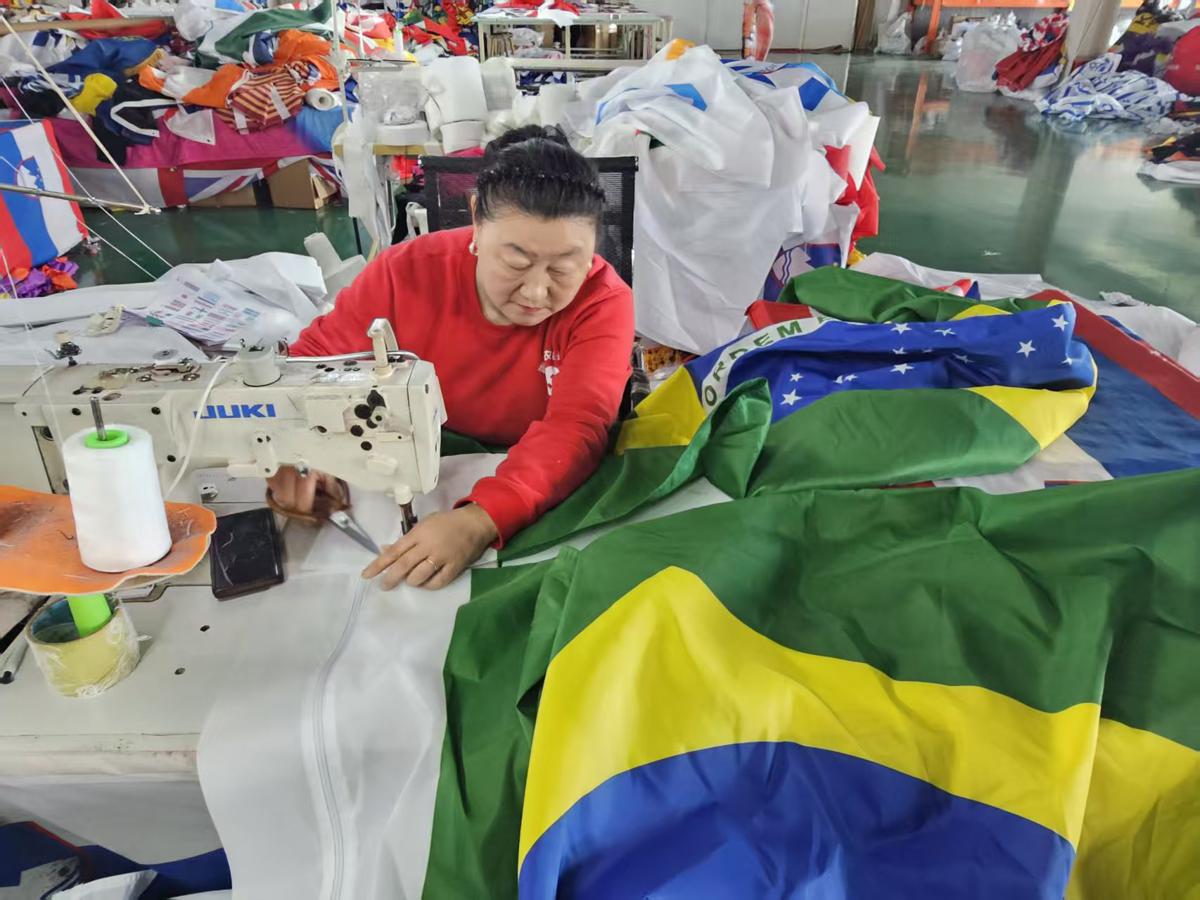 Работник е зает пред поточната линия в Qingdao Wonderful Flag Industry Co. Компанията доставя знамена за Световното първенство по футбол от 1998 г. [Photo provided to chinadaily.com.cn]