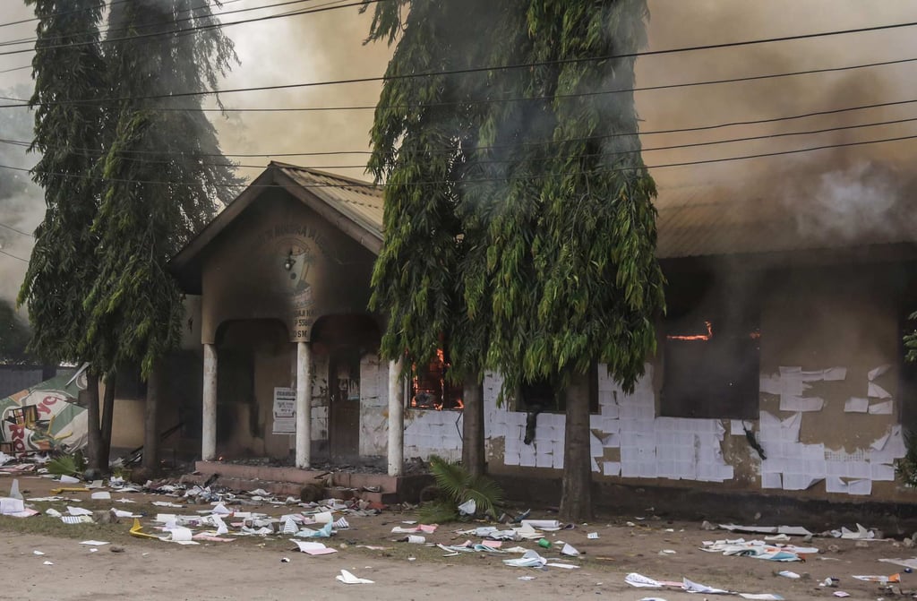 Избирателна секция е опожарена, докато избухват сблъсъци в Дар ес Салам на 29 октомври. Снимка: AFP