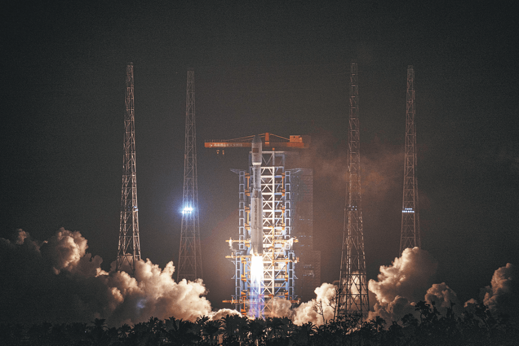 Ракета носител Long March-8 Y6, носеща сателити Spacesail, излита от площадка за изстрелване на търговски космически кораб в Wenchang, провинция Hainan, на 12 март. PU XIAOXU/XINHUA
