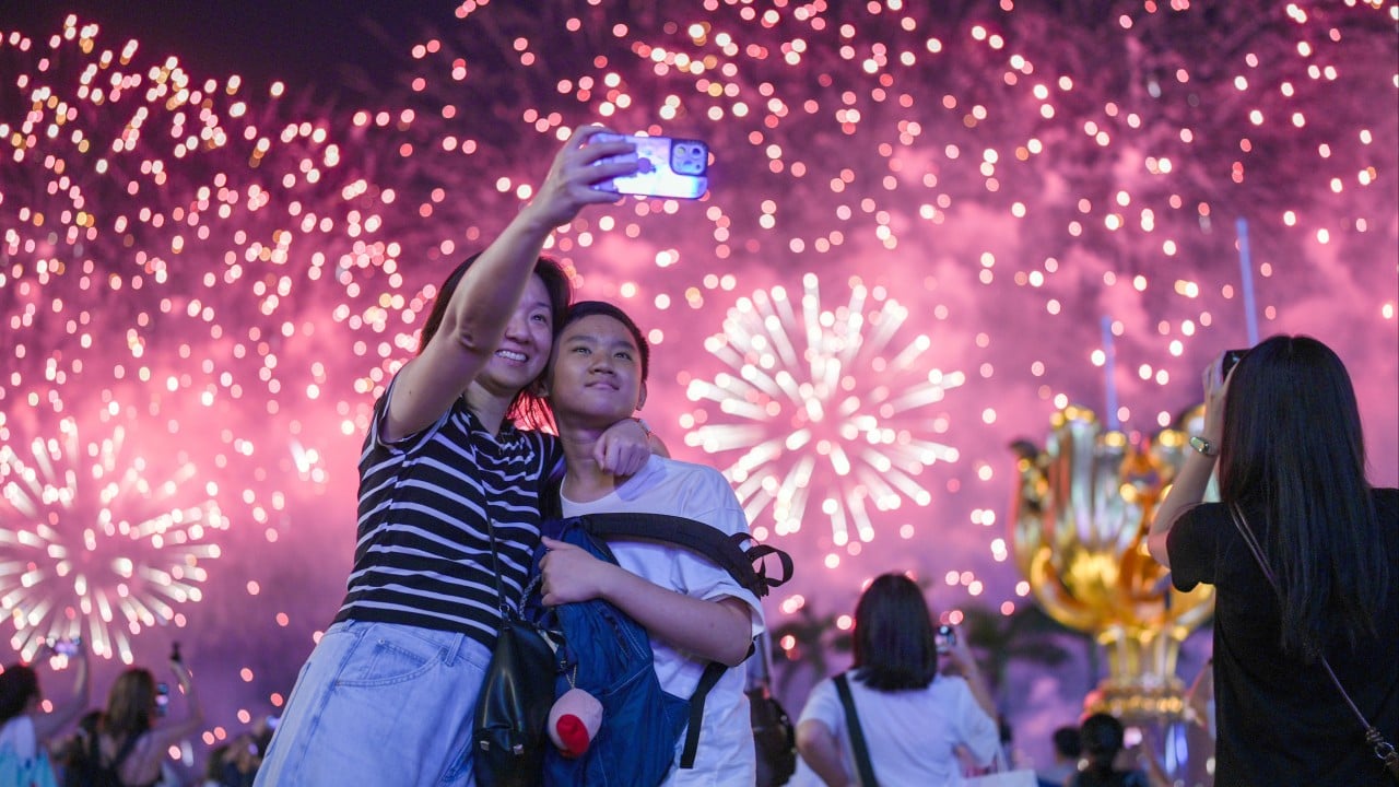 Стотици хиляди зрители опаковаха пристанището на Хонконг за фойерверки в националния ден, като ограничиха празненствата, които включваха отворен ден на военноморските кораби PLA и посетителите, слизащи върху града за пазаруване, разглеждане на забележителности и туризъм.