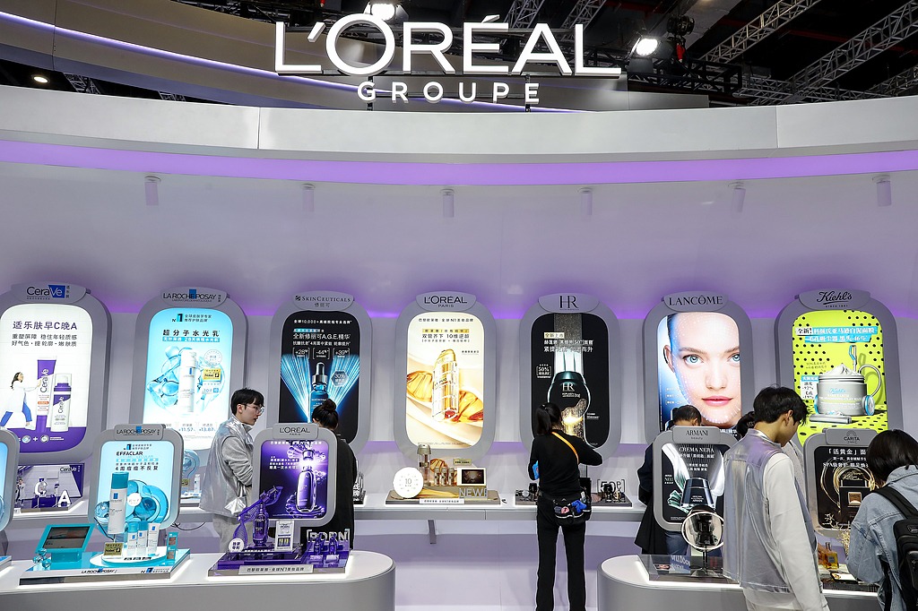 Посетителите проверяват козметичните продукти, изложени на щанда на L“Oreal в изложбената зона за потребителски стоки на осмото Китайско международно изложение за внос (CIIE) в източен Китай, Шанхай, на 5 ноември. [Photo/VCG]